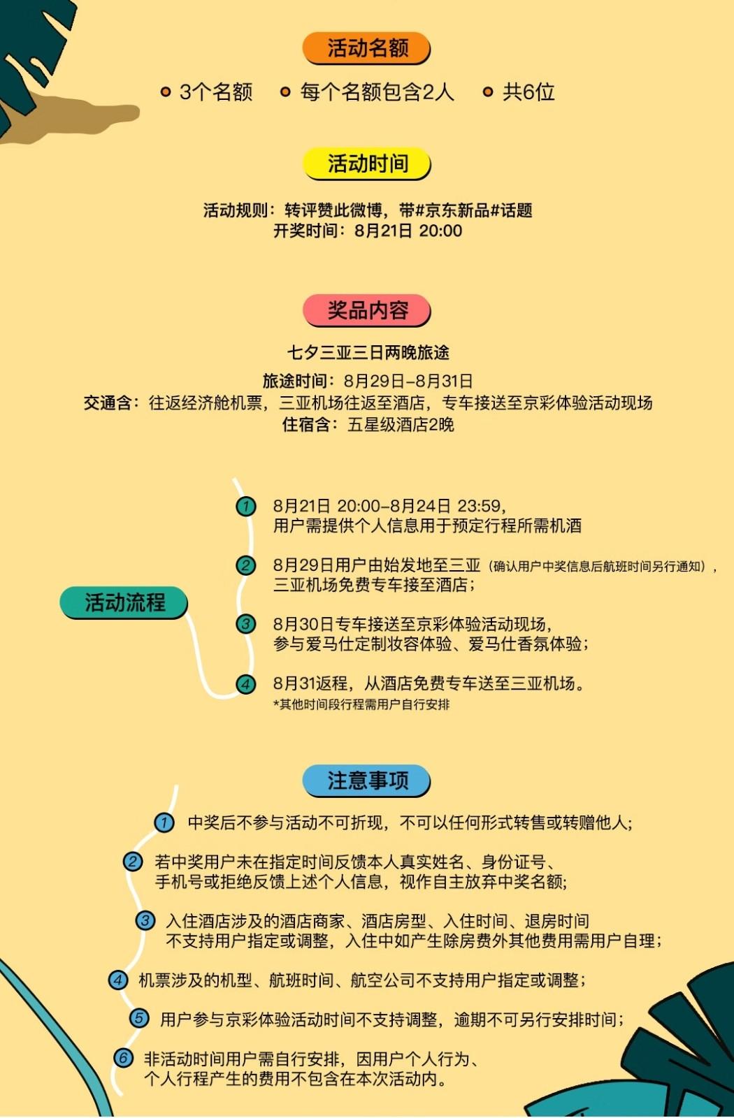 七夕想要与爱人携手漫步洁白沙滩、沉醉于南国暖阳,或是共度一场烛光晚宴?即日起前往京东官方微博参与活动,即有机会赢取这份甜蜜大奖。8月21日京东将揭晓中奖名单,幸运爱侣将在8月底启程飞往三亚,旅程中不仅可以畅享阳光沙滩的惬意、品尝地道海鲜美食,更可由专车接送至爱马仕线下门店,享受由爱马仕专业彩妆师打造的七夕专属妆容,并沉浸式体验爱马仕香氛,让精致的妆容与独特的香气铭刻这场浪漫之旅。